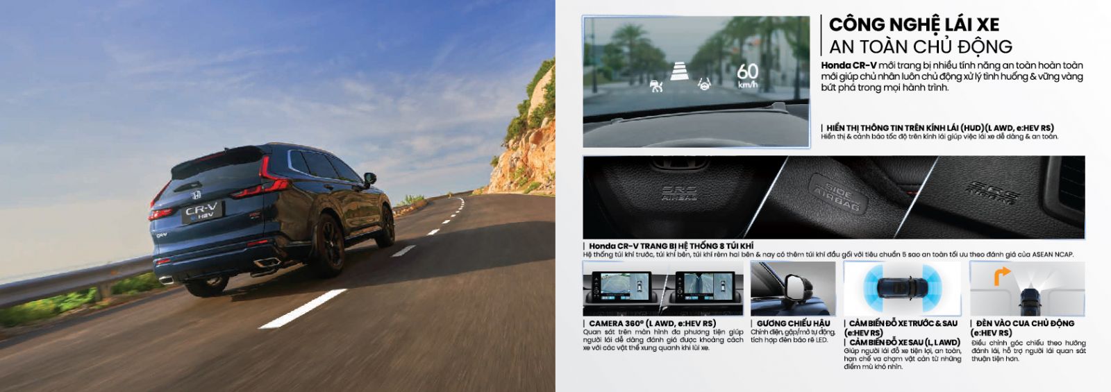 – Các tính năng an toàn bị động bao gồm: hệ thống 8 túi khí gồm: túi khí trước, túi khí rèm và cả túi khí cho đầu gối ở hàng ghế trước. Mẫu xe đã chính thức đạt chứng nhận An toàn 5 sao trong thử nghiệm va chạm được tiến hành bởi Chương trình đánh giá xe mới khuvực Đông Nam Á (ASEAN NCAP). Những tính năng an toàn này chắc chắn sẽ giúp chủ sở hữu CR-V yên tâm cầm lái để chinh phục mọi cung đường.