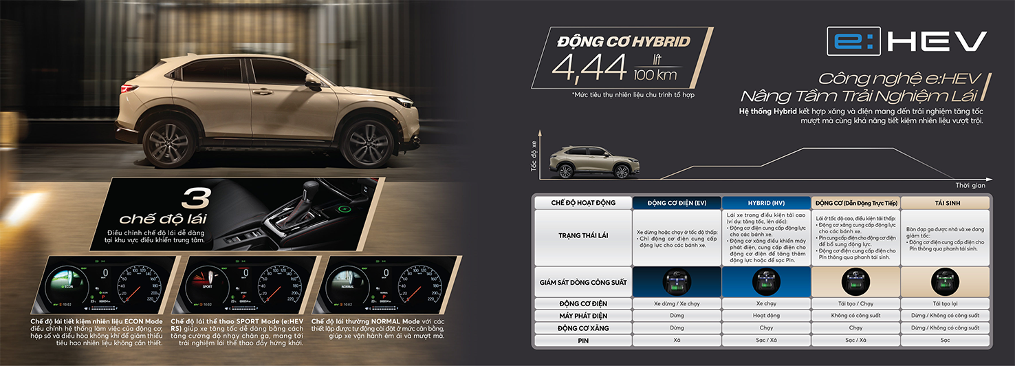 Động cơ xăng có thể được tách rời khỏi phần còn lại của hệ thống truyền động Hybrid, nên sẽ chỉ hoạt động khi cần thiết, tùy thuộc vào trạng thái sạc pin và các thông số khác. Khi vận hành, động cơ đốt trong 1.5L và mô tơ điện có thể sản sinh công suất cực đại lần lượt là 105 Hp (78kW) ở dải vòng tua 6.000 – 6.400 vòng/phút và 129 Hp (96kW) ở dải vòng tua 4.000 – 8.000 vòng/phút. Honda HR-V e:HEV RS mới không chỉ duy trì khả năng vận hành ổn định vốn có mà còn làm tăng thêm khả năng tiết kiệm nhiên liệu lên tới hơn 30% so với động cơ 1.5L DOHC i-VTEC và khả năng tăng tốc mượt mà hơn.