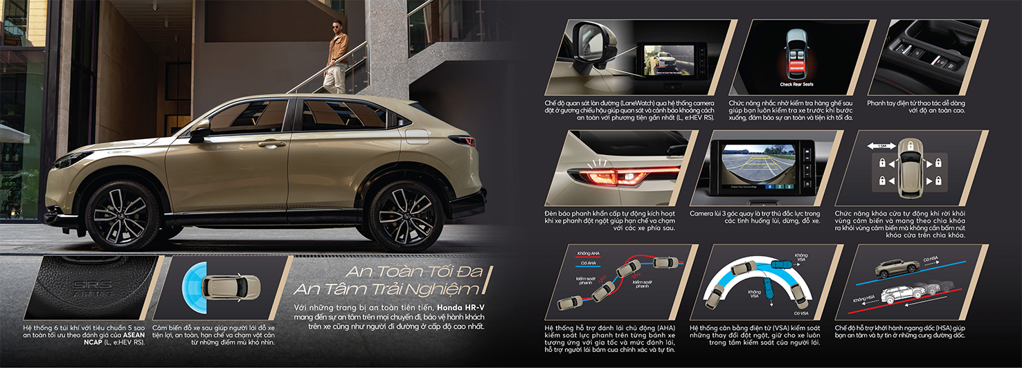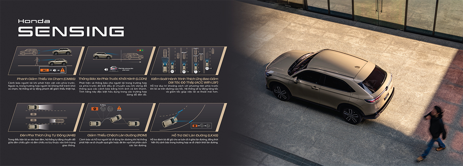 Tất cả các phiên bản của HR-V mới đều được trang bị Hệ thống công nghệ hỗ trợ lái xe an toàn tiên tiến Honda SENSING, bảo vệ toàn diện cho người lái, hành khách, người đi đường và các phương tiện xung quanh. Hệ thống bao gồm 6 tính năng ưu việt: